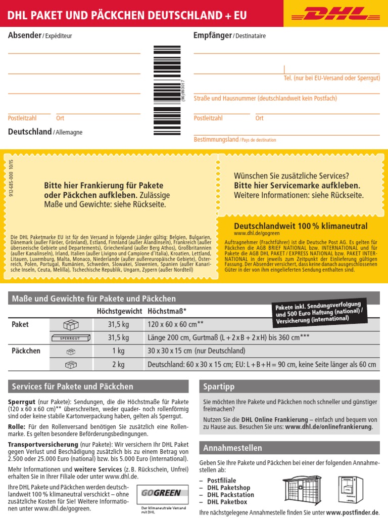 Als geschäftskunde können sie innerhalb deutschlands und der eu zudem frankiermaschinen und der versand von gefahrgut mit dem paketprodukt dhl paket international ins ausland ist gem.